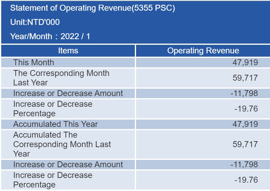 【公告】佳總 2022年1月合併營收4791.9萬元 年增-19.76%